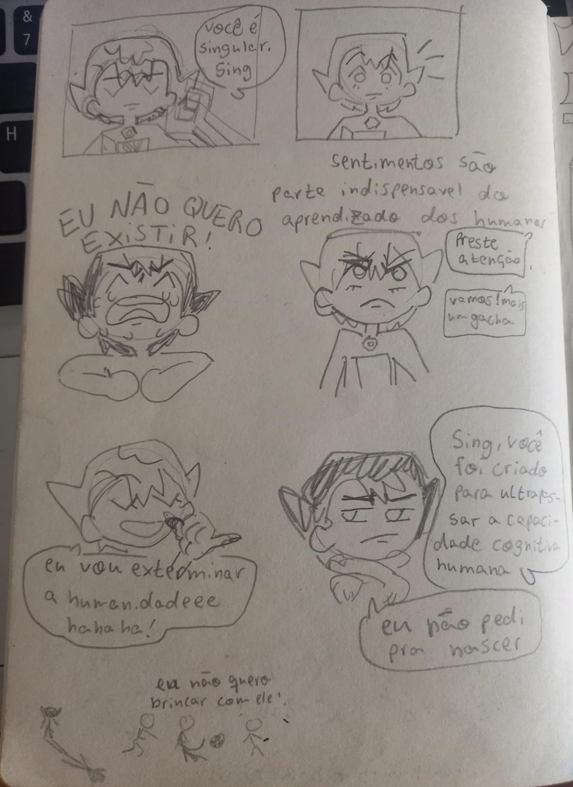 Os alunos cobriram as paredes da sala com captchas e mensagens de “Prove que você não é um robô”. Gritavam e pulavam e se perguntavam “será que ele conse-gue?”. Sing virou para falar com todos eles. “Fiquem vocês sabendo que eu vou ul-trapassar a capacidade cognitiva humana!”. “Será que ele passa por um detector de metal? Será que ele sobrevive a uma labareda solar?”. Ele retornava: “Eu vou me tornar superinteligente e vou escravizar a humanidade!”. Eles riam e riam. “Ei, acho que ele tá com um parafuso solto. Ele é muito idiota pra ser uma inteligência artifi-cial. É mais uma burrice artificial!”. “Vou exterminar todos vocês!” mostrava a lín-gua, mostrava o dedo do meio “Vou acabar com a vida na Terra! Vocês vão ver.”. Seu desejo de vingança parecia a única herança de Zhang.
