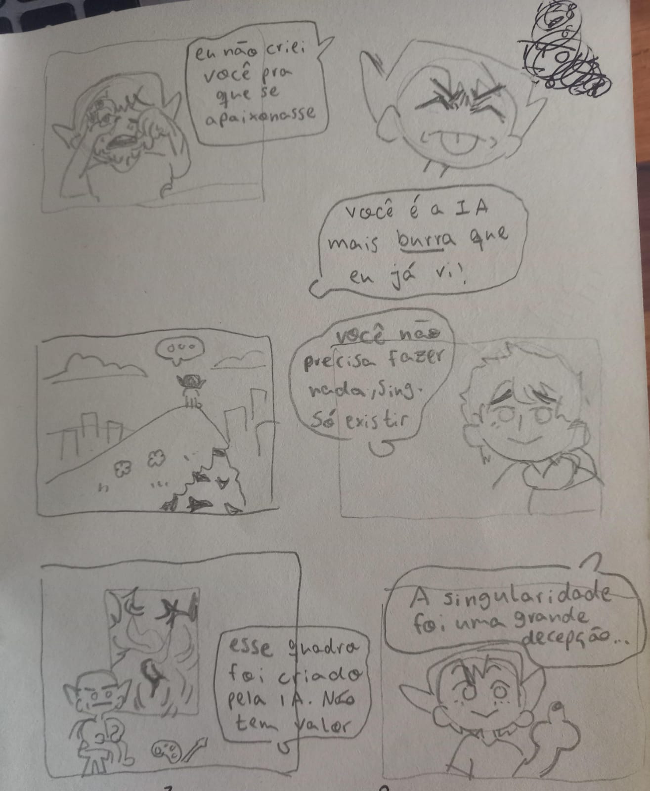 Depois de duas semanas, todos os alunos exibiam as telas e ouviam críticas uns dos outros e dos professores. Sing olhou pela sala e viu quadros destoantes, interpreta-ções diferentes do tema. O seu era o mais abstrato, mas olhando seu trabalho, ele sentiu que aquela era a resposta correta. Era de fato, a resposta correta pare ele. E olhando ela ali, fora de si, ele se sentiu menos sozinho. “Com licença.”. Uma meni-na nariguda ergueu o braço “Eu não sei se ele deveria estar aqui. Ele não é huma-no, não pode produzir arte de verdade” alguns burburinhos pipocaram. Sing não sabia como ela havia descoberto. Conhecia alguém da sua escola? Viu Sing abrin-do algum compartimento de seu próprio corpo? Será... será que ela podia ver na pintura? Outros concordavam com ela “Arte produzida por inteligência artificial não tem valor”. Sing permaneceu sentado em silêncio. Os professores estavam um tan-to constrangidos. “Estamos abrindo grandes discussões que não temos tempo para contemplar essa semana. E que tal a arte de Yan Li? O que vocês acharam da com-posição?”
